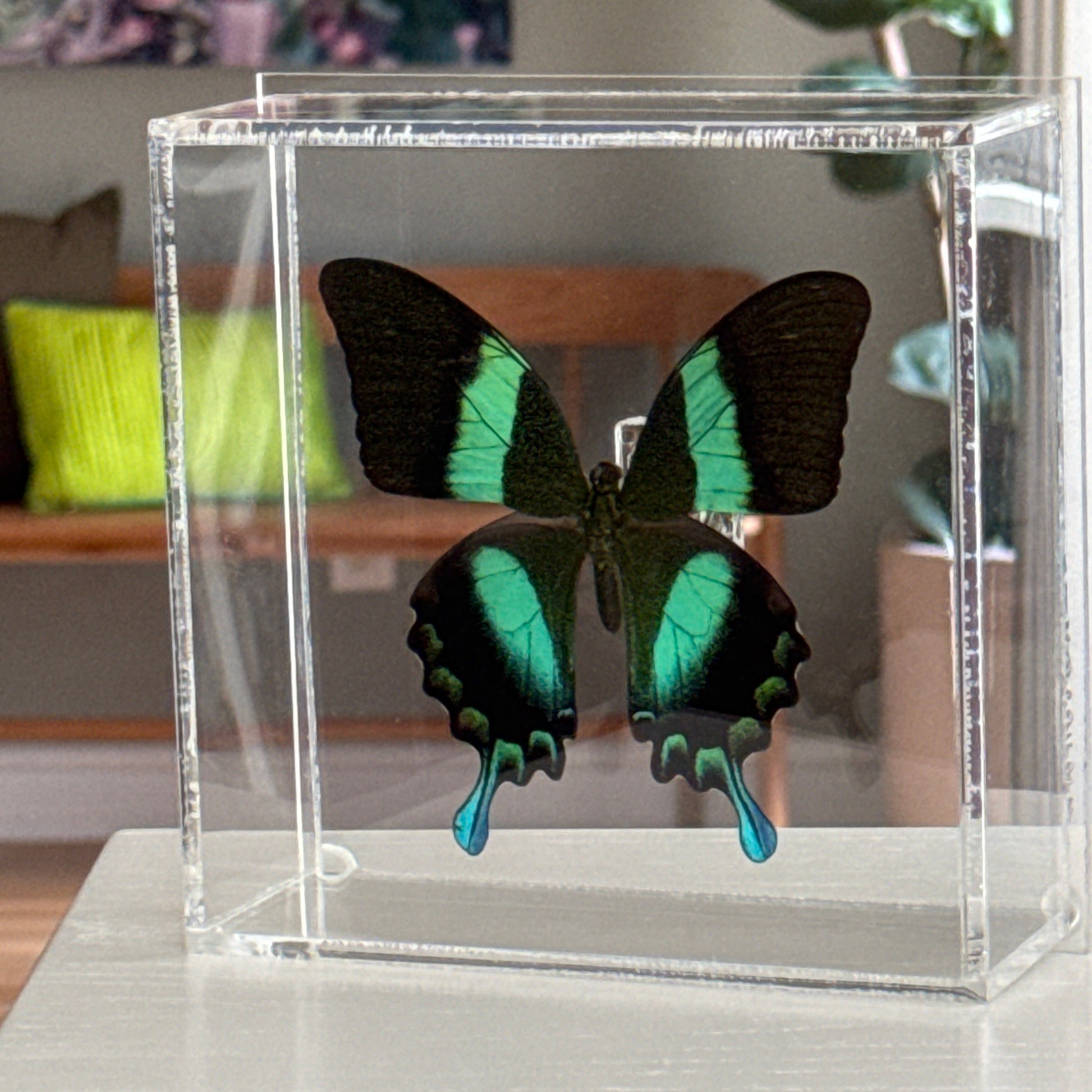 The Papilio blumei fruhstorferi, also known as the Peacock Swallowtail, features a brilliant green-and-blue iridescent band that shimmers like a jewel. Native to Indonesia, this butterfly is often admired for its metallic coloration and distinctive wing shape. Presented in a 6 x 6 x 2 inch acrylic box, it captures the essence of tropical vibrance and structure.