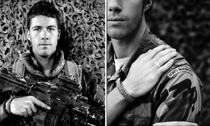 The series ‘Here are the young men’ is divided in three subseries: ‘Marked': black and white triptychs of marines before, during and after their tour of duty to Afghanistan. ‘Armored’: diptychs of black and white portraits of marines back from patrol and photos of their good luck charms. ‘Committed’: color photos of marines on nightly patrols and on their Combat Outpost Tabar in Uruzgan, Afghanistan.