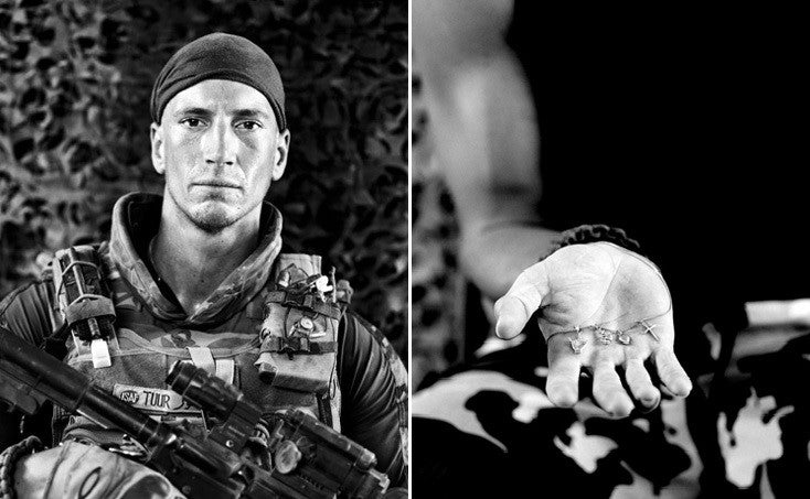The series ‘Here are the young men’ is divided in three subseries: ‘Marked': black and white triptychs of marines before, during and after their tour of duty to Afghanistan. ‘Armored’: diptychs of black and white portraits of marines back from patrol and photos of their good luck charms. ‘Committed’: color photos of marines on nightly patrols and on their Combat Outpost Tabar in Uruzgan, Afghanistan.