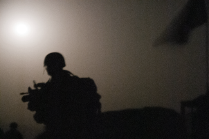 The series ‘Here are the young men’ is divided in three subseries: ‘Marked': black and white triptychs of marines before, during and after their tour of duty to Afghanistan. ‘Armoured’: diptychs of black and white portraits of marines back from patrol and photos of their good luck charms. ‘Committed’: color photos of marines on nightly patrols and on their Combat Outpost Tabar in Uruzgan, Afghanistan.