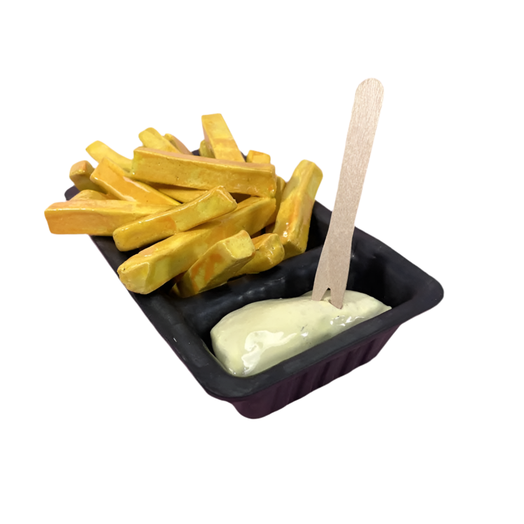 Dutch people eat their fries with mayonnaise. Patatje Mayo is the guilty pleasure of many in the small country of The Netherlands. When ordered in a traditional snackbar, it's served in a two compartment open container with mayonnaise separate from the fries. You eat it with a small wooden fork. This one is made of glazed pottery and you can hang it on your wall.