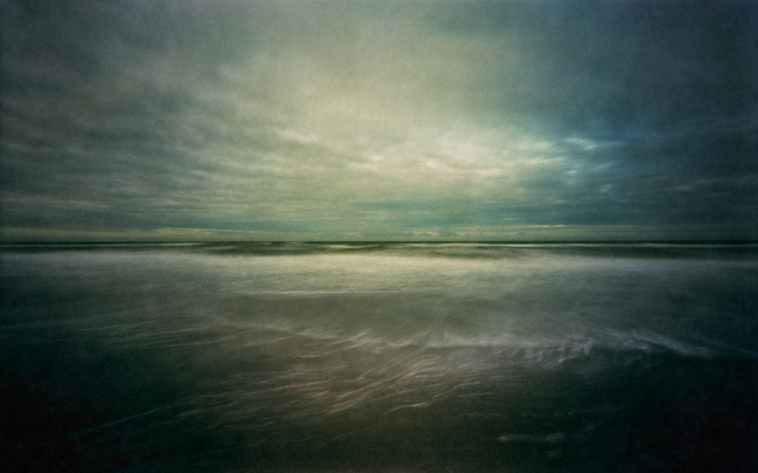Pinhole seascapes are all photographed with a wooden pinhole camera on old fashioned 6x9 film. The aperture used is F235 which leads to long exposure times, even on bright days. During this exposure time, the waves, sand, water, sky, clouds all get mixed together and a new landscape is captured in a wooden camera.