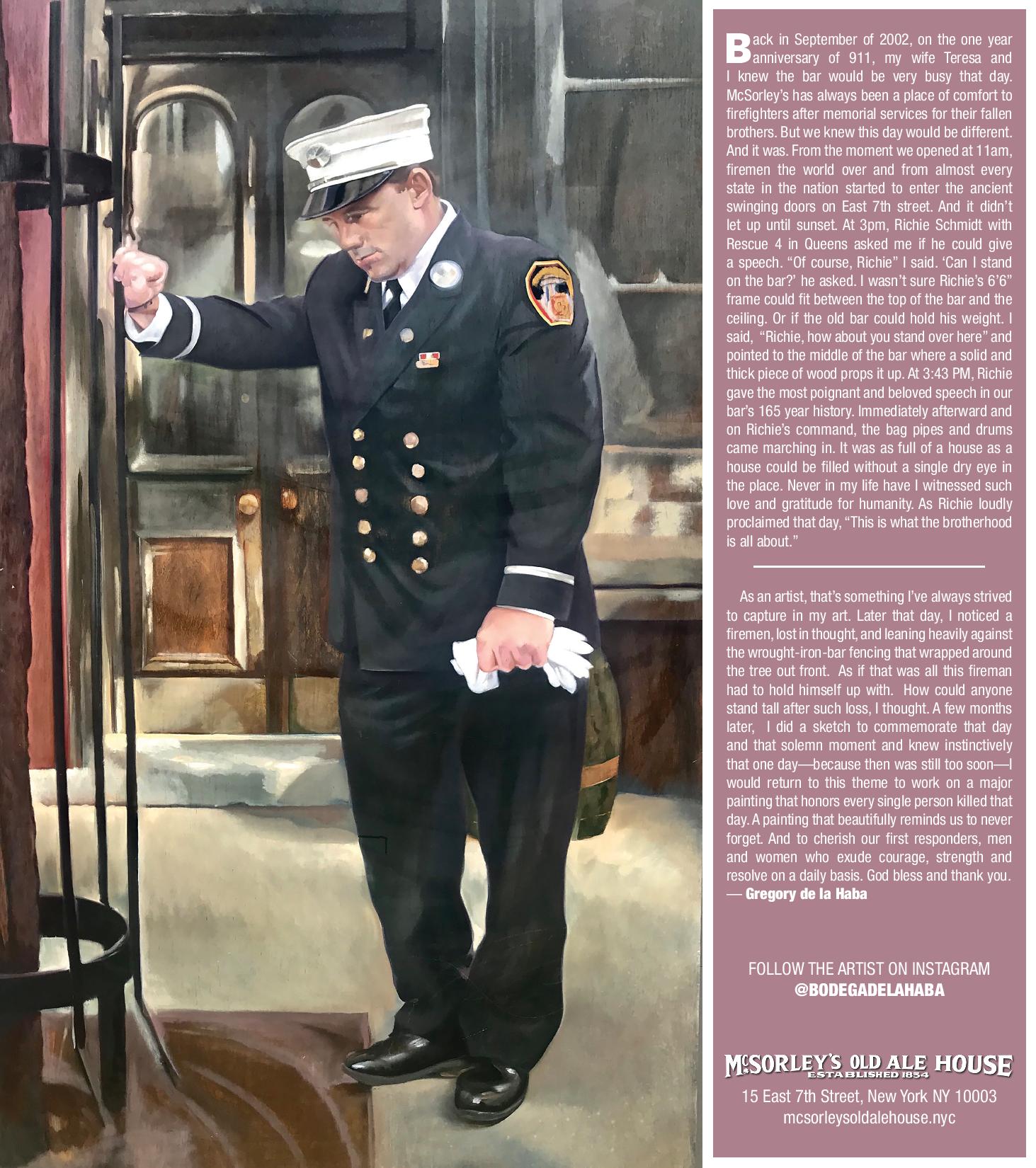 Back in September of 2002, on the one year anniversary of 911, my wife Teresa and I knew the bar would be very busy that day. McSorley’s has always been a place of comfort to firefighters after memorial services for their fallen brothers. But we knew this day would be different. And it was. From the moment we opened at 11am, firemen the world over and from almost every state in the nation started to enter the ancient swinging doors on East 7th street. And it didn’t let up until sunset. At 3pm, Richie Schmidt with Rescue 4 in Queens asked me if he could give a speech. “Of course, Richie” I said. ‘Can I stand on the bar?’ he asked. I wasn’t sure Richie’s 6’6” frame could fit between the top of the bar and the ceiling. Or if the old bar could hold his weight. I said, “Richie, how about you stand over here” and pointed to the middle of the bar where a solid and thick piece of wood props it up. At 3:43 PM, Richie gave the most poignant and beloved speech in our bar’s 165 year history. Immediately afterward and on Richie’s command, the bag pipes and drums came marching in. It was as full of a house as a house could be filled without a single dry eye in the place. Never in my life have I witnessed such love and gratitude for humanity. As Richie loudly proclaimed that day, “This is what the brotherhood is all about.”
