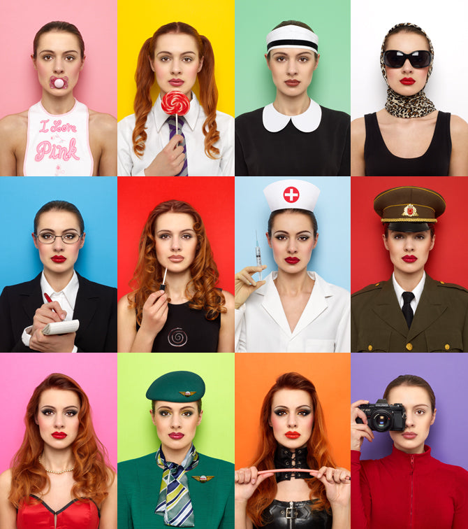 Using one model throughout serves to illustrate the power of women, with makeup and dress, to manipulate, adapt, reinvent and represent themselves in numerous different guises and personas.