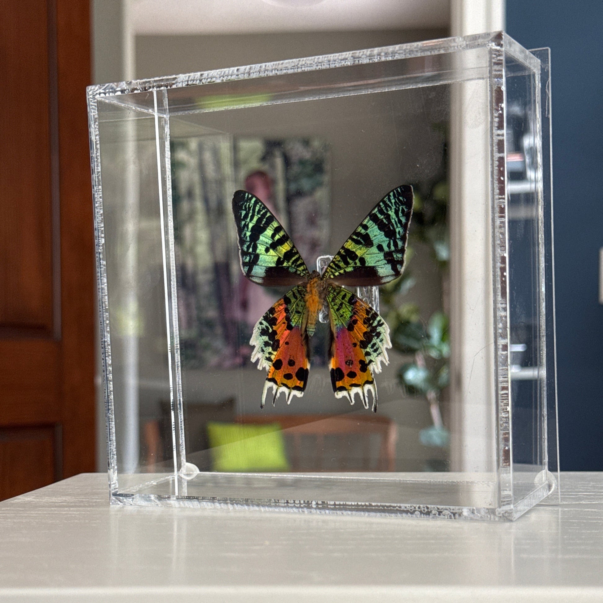 The Chrysiridia Rhipheus, commonly known as the Sunset Moth, is renowned for its kaleidoscopic hues — shimmering greens, fiery oranges, and iridescent blues. Despite its name, it is a day-flying moth often mistaken for a butterfly due to its spectacular coloration. Mounted in a 6 x 6 x 2 inch acrylic shadow box, this piece captures the vivid beauty of one of nature’s most dazzling insects.